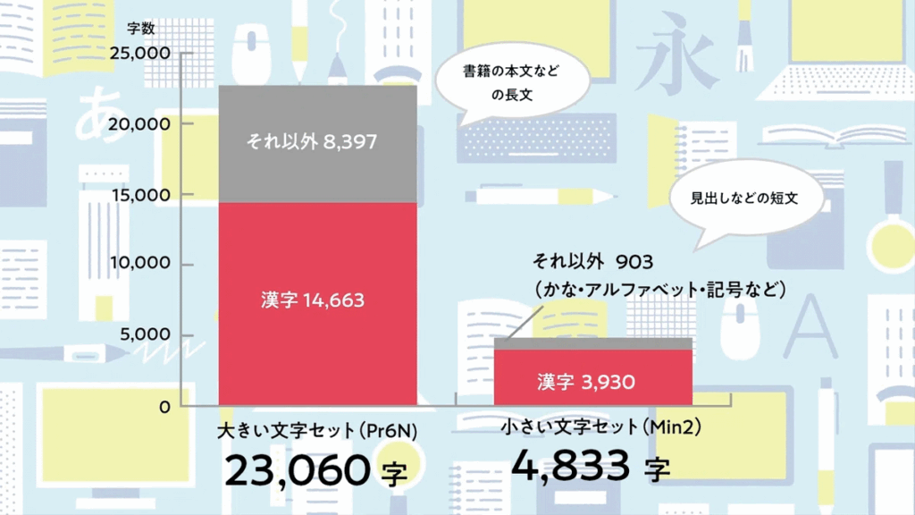 どの文字を収録するかを定める「文字セット」や、太さのバリエーションをいくつ用意するかによっても、制作に必要な文字数は異なります。