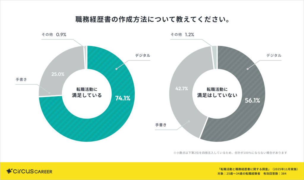 満足層の約7割が職務経歴書を「デジタル作成」で効率化。さらに3人に1人が「企業ごとの書き分け」を行い、質の高い転職準備をしていたことが明らかに。