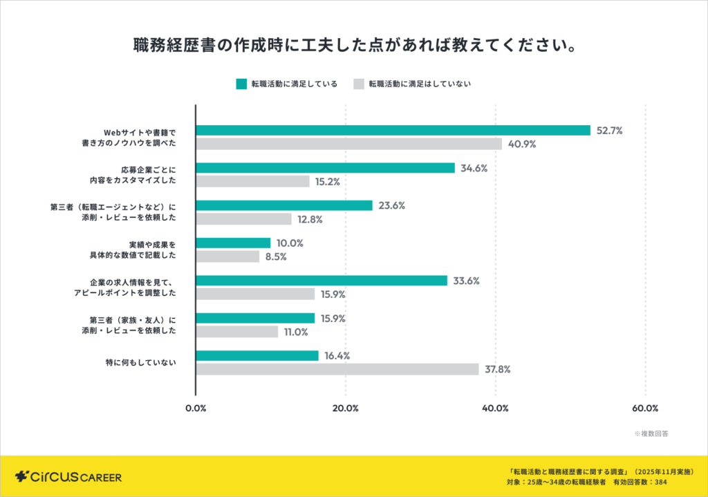 次に、職務経歴書の作成時にどのような工夫を行ったかを比較したところ、満足度を分ける行動の差が浮き彫りになりました。