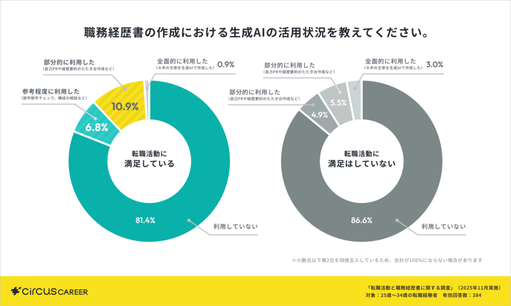 職務経歴書は、個人の経験や成果を言語化する必要があるため、生成AIにゼロから丸投げをしてしまうと、具体性に欠ける内容になってしまいます。満足している層のように、生成AIを文章の推敲や構成のヒントを得るためのサポーターとして上手に取り入れられるかどうかが、現時点での生成AIの活用におけるポイントであると考えます。