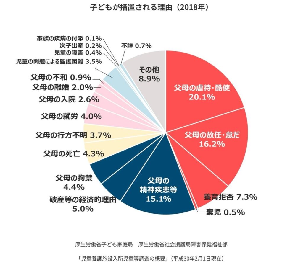 児童養護施設で暮らすことになる理由として、2000年以降最も多いのが「虐待」です。続いて「放任・怠惰」、「親の精神疾患」が挙げられます。