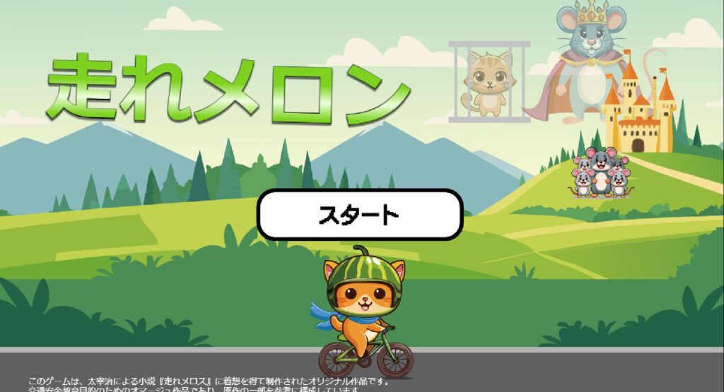 『走れメロン』は、主人公の自転車に乗ったネコであるメロンが、ネズミの王に連れ去られた妹・マロンを助けるため、自転車に乗ってネズミの王の城を目指すアクションゲームです。