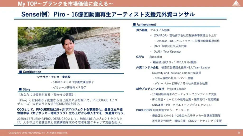 「ブランクを市場価値へ変える」キャリアの空白を武器にする唯一のリスタート支援企業。GAFAや外資コンサルで培った戦略立案力と累計16億回再生のIPブランディング知見を強みに、実績構築型支援「My TOP」を運営。留学・休職等の空白期間を「自己ブランド」として明文化するプロジェクトリードを担う。その実績をストーリーライティングで職務経歴書へ反映し、ブランクを武器に変えて再出発できる「居場所」を展開。