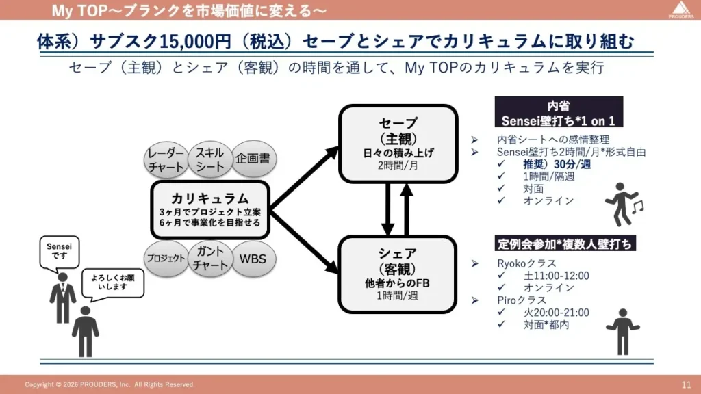 「セーブ(主観)」と「シェア(客観)」を行き来するプロセスを通して、My TOP独自のカリキュラムを実施します。カリキュラムは、最短3ヶ月でプロジェクト企画から実行、6ヶ月で事業化実現に向けた具体的なノウハウが凝縮されたTo Doとなっており、履歴書の空白を「武器」に変えた「Sensei(先生)」たちのノウハウや共通事項によって体系化されました。