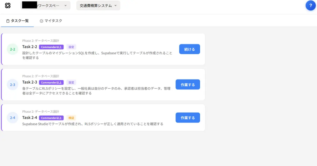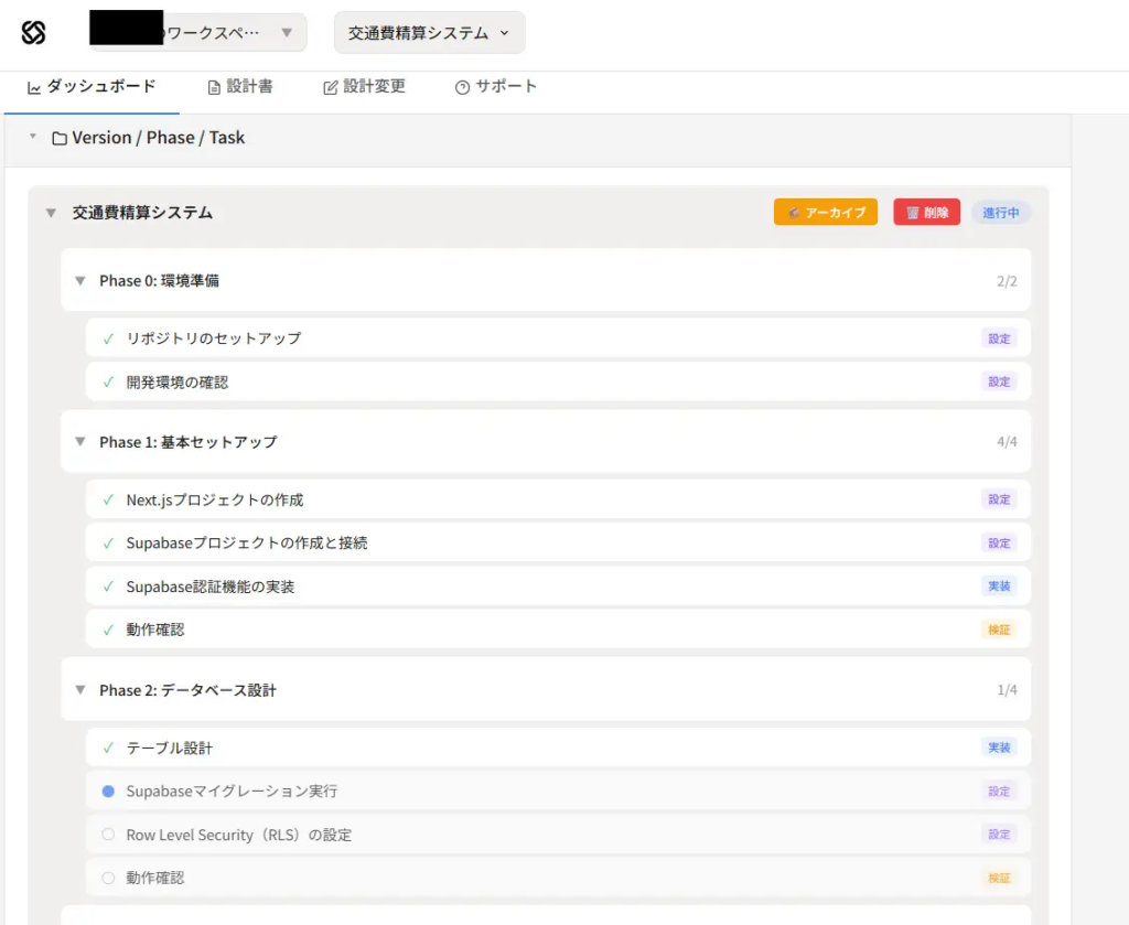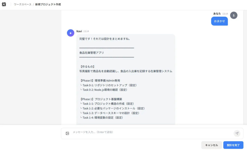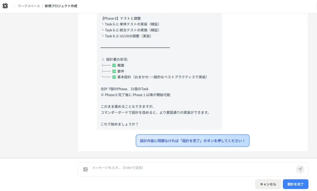 AIとの壁打ちで要件を整理。会話するだけで開発設計書が自動生成され、Phase・Taskに分解されます。