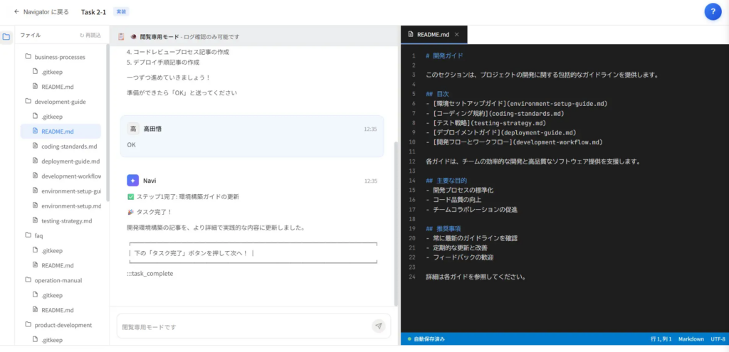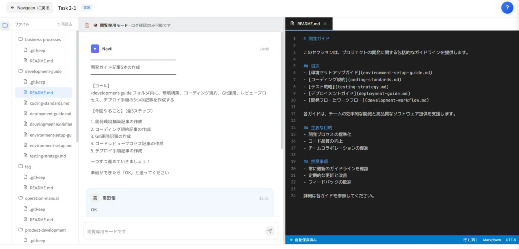 画面の指示に従ってクリックしていくだけ。一部外部ツール(VS Code等)での作業が発生しますが、エラー対応やファイル作成もAIがサポートします。