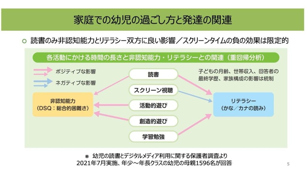 「読書」のみが⾮認知能⼒とリテラシー双⽅に良い影響/スクリーンタイムの負の効果は限定的。』